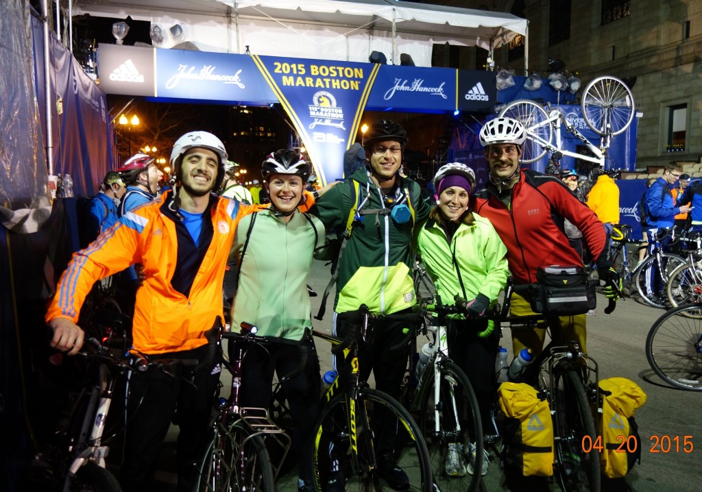 The evening before the race, Casey, Julie and I met up with Rachel, Dearon and Sam for dinner at Sunset Grille & Tap in Allston. Afterwards we put Casey to bed, but the rest of us gathered our bikes and headed to Hopkinton for the midnight marathon ride. We lucked out with the weather for the bike ride, and there was a great turn-out once again. Unfortunately we missed the memo and started riding around 12:30am which was still before the peloton came through, but everyone had a great time regardless!