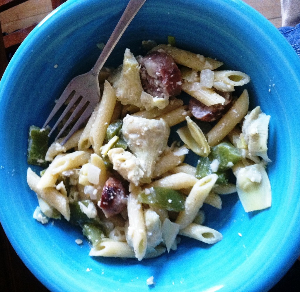 The second time that I brought it to a pasta party, my coach and his daughter, “number six” (we were all jersey numbers for those four years, even his own daughter, in his own home), drove me home after. I forgot the leftover hockey pasta in their car. When they reached their house and discovered that they were locked out, they sat in the car eating the hockey pasta with their hands until the Mrs. got home. They declared it a delicious lifesaver.