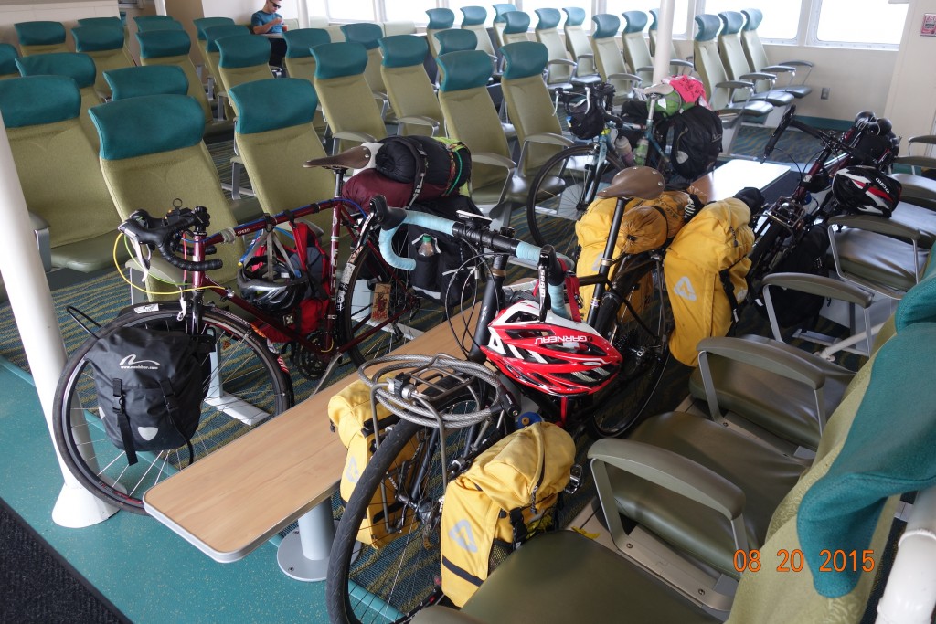 After we parted ways with Gill, we met Austin and Brittney, who started riding in Florida. They are taking a few days off in San Francisco and then continuing to Seattle along the coast, before doubling back to Portland, where they are relocating to. They caught up to us about 30 miles from Vallejo, so we decided to ride the rest of the way together. We stopped at Safeway for lunch, but otherwise pushed to make it in time for the 4PM ferry! There was a steady wind coming in from the bay for the last 15 miles, which slowed us down, but we made it with about 15 minutes to spare. We were happy to have them join us, because we would have struggled to find the motivation to push so hard for the last segment of the day.