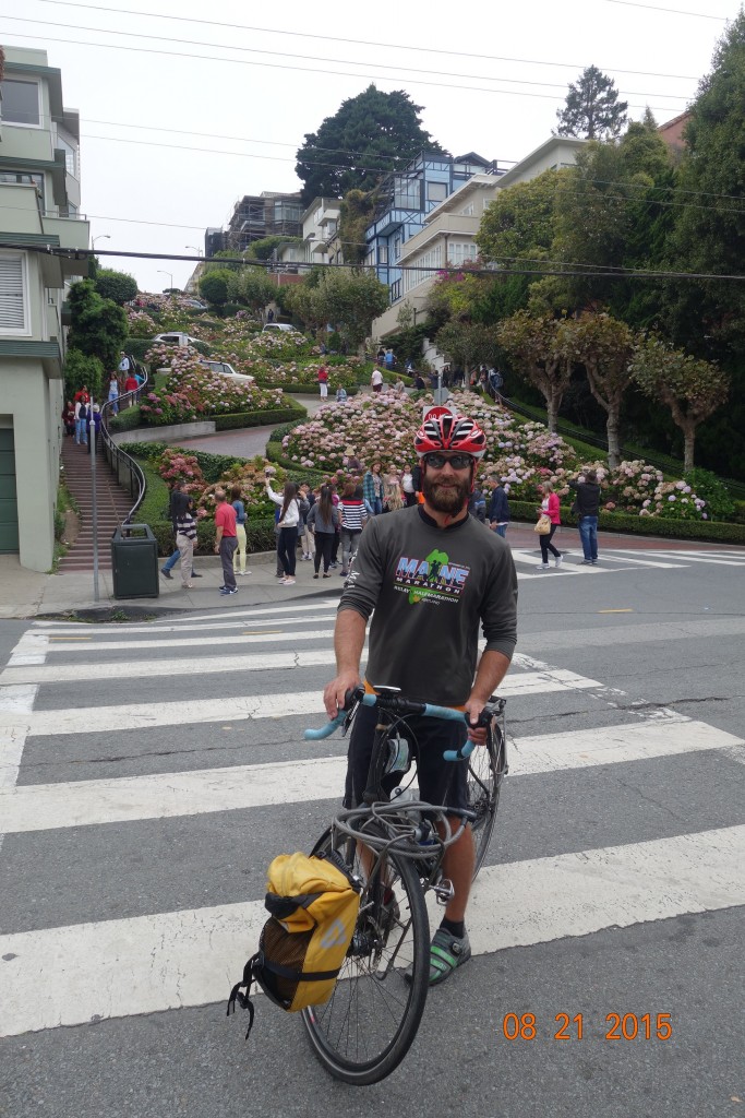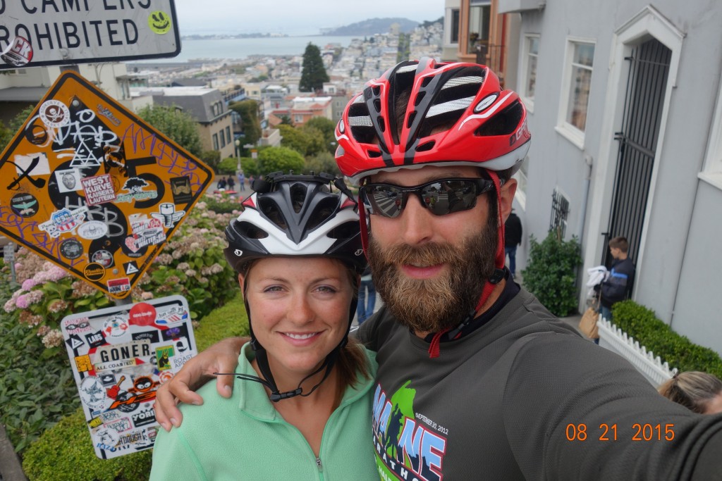 On our way to the beach, we climbed one of the steep hills in the city so that we could ride down Lombard street.  It wasn’t much fun because of traffic (it took a few minutes to roll down the street which is only a couple hundred yards long), but we’re happy to say we have done it.