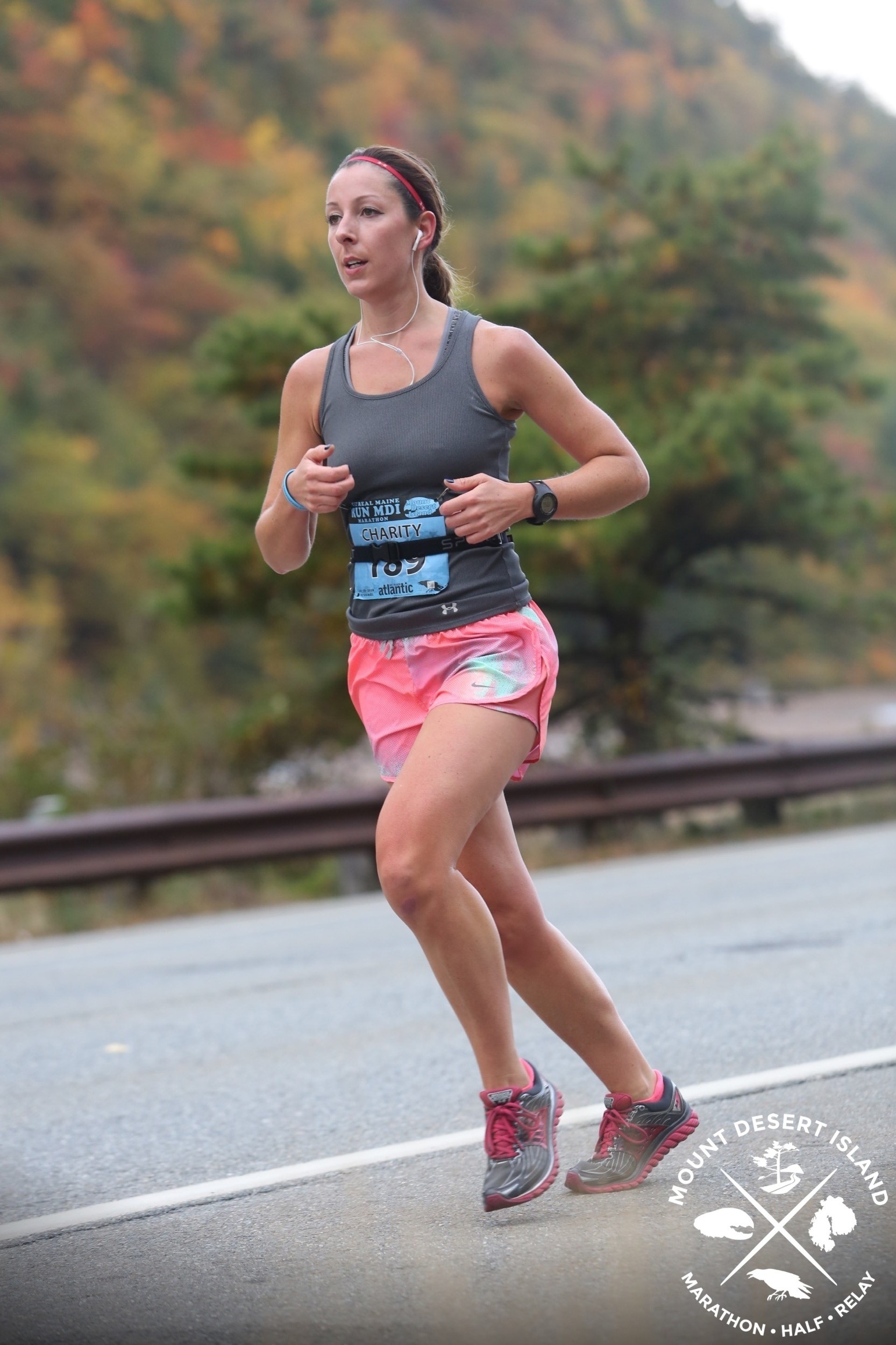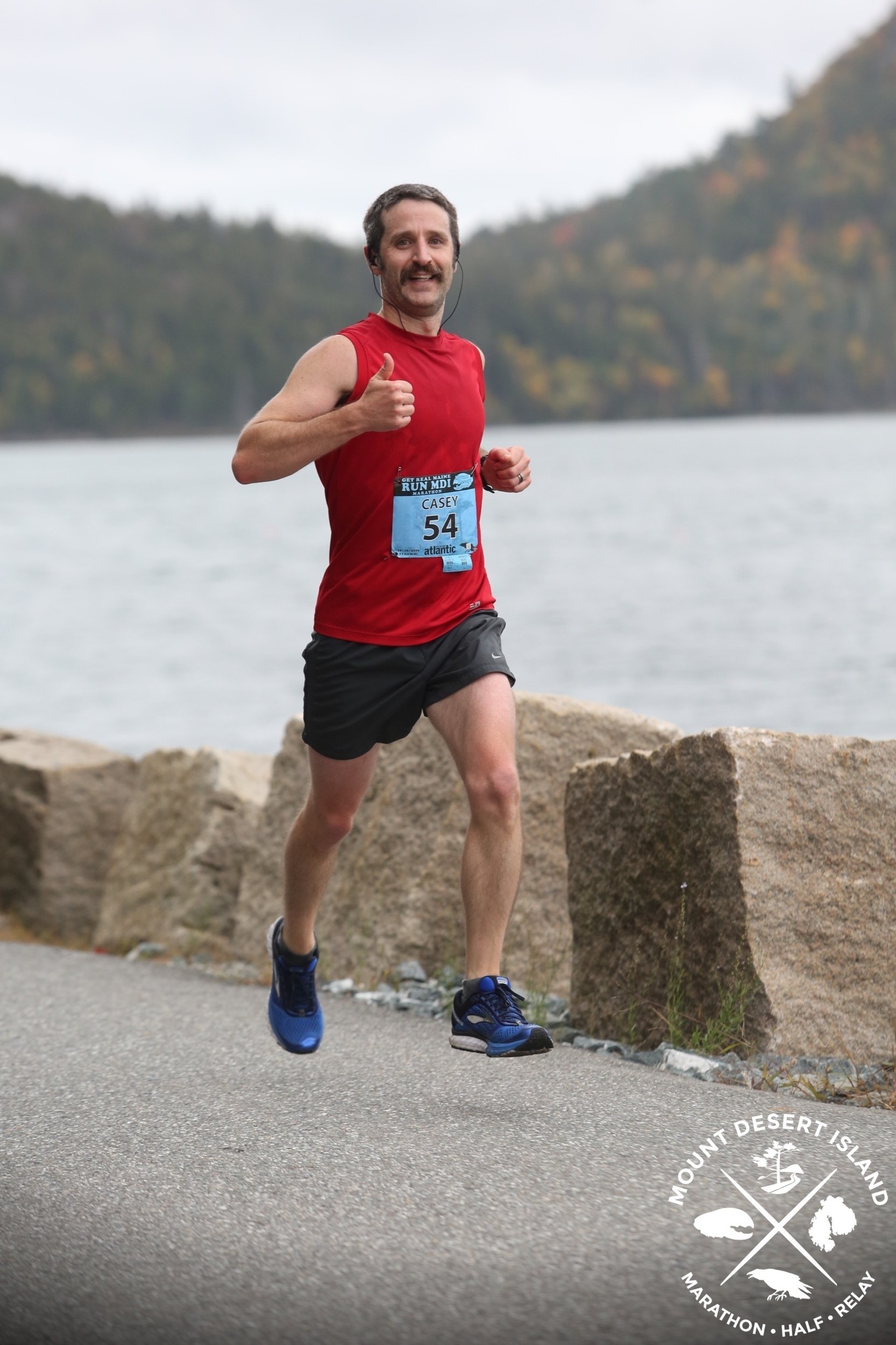 The next morning, we all met up again for breakfast before the runners hurried to the start line. Rachel and I followed shortly afterwards to see them off, then ditched our car along the course to bike upstream against the flow of runners until we saw all of ours, then turned around and continued to the finish. A fun surprise was a boat of fishermen cheering over the loudspeaker and blowing the boat’s horn while floating along in Somes Sound, near the half-way point, as the runners passed on shore.