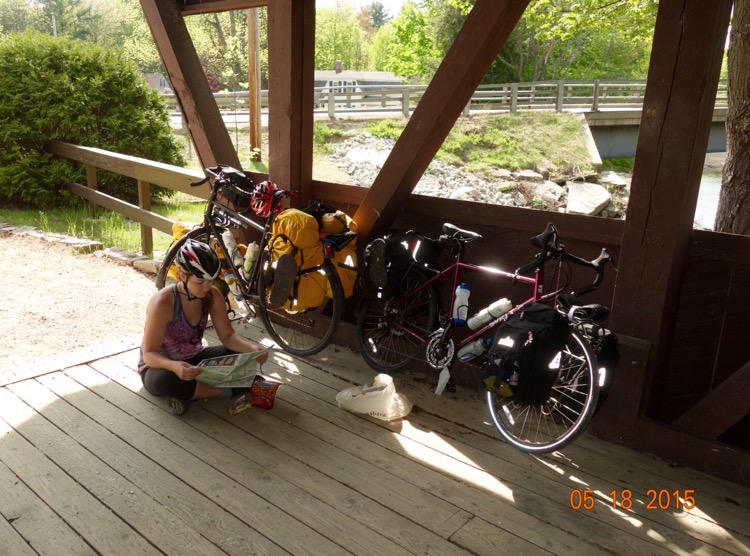We both slept great last night, despite some hooting and pecking nearby. When we got up, it was cold and cloudy, but the weather improved as the day went on. Our goal was to start riding early, but it didn’t happen until 10 am. We blame that on our lack of sleep a few nights ago, when we were up until midnight packing and cleaning, then woke to drive to Maine at 4:30 am the next morning after an anxious nights sleep.